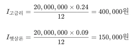 연 24%의 고금리 대출 2,000만 원을 쓰고 계신 사장님이 연 9% 햇살론으로 갈아탔을 때, 한 달에 아낄 수 있는 이자 비용을 계산해 보죠.