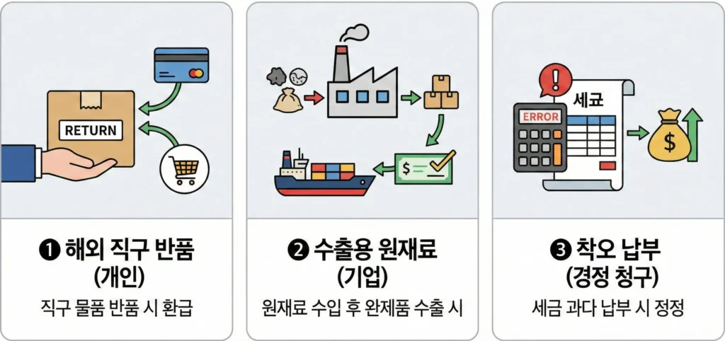 관세 환급은 납세자가 착오로 세금을 더 냈거나, 수출용 원재료를 수입했다가 다시 수출하는 경우, 혹은 해외 직구 물품을 반품했을 때 국가로부터 세금을 돌려받는 제도입니다.