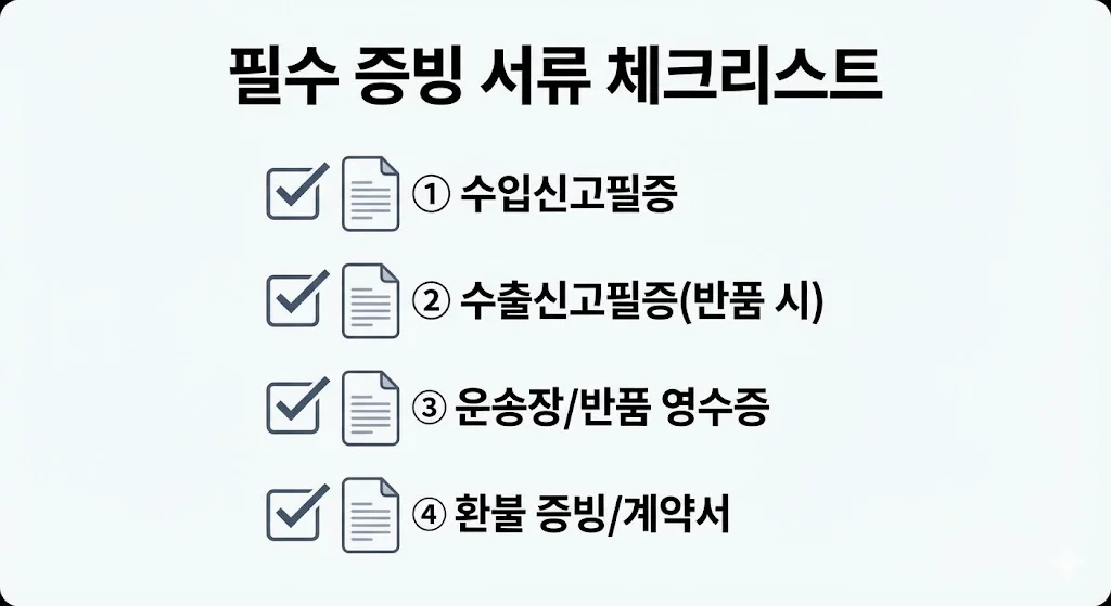 - 필수 서류: 수입 신고 필증, 수출 신고 필증(반품 시), 반품 운송장(운송 증빙), 환불 증빙 서류.