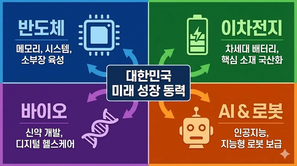 국민성장펀드의 투자 대상은 명확합니다. 바로 정부가 지정한 ‘국가전략기술’ 및 ‘미래 유망 신산업’ 분야입니다. 펀드 자금이 흘러 들어갈 핵심 섹터와 대표적인 관련주를 분석해 보겠습니다.