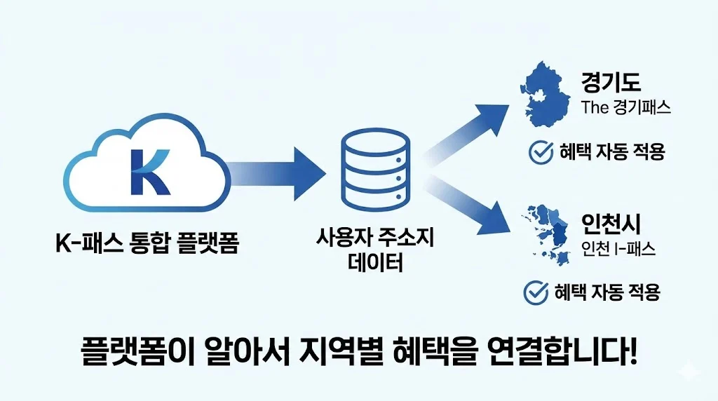 • 자동 주소지 연동: K-패스 가입 시 등록한 여러분의 주소지가 이미 시스템에 기록되어 있습니다. 따라서 시스템이 알아서 “아, 이분은 경기도민(혹은 인천시민)이구나!”라고 인식하고 해당 지역만의 추가 혜택을 자동으로 적용해 주는 원리입니다.