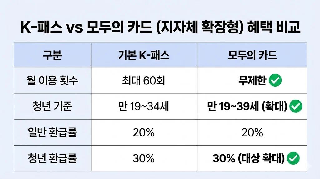 3. K-패스 vs 모두의 카드(지자체 확장형) 혜택 차이