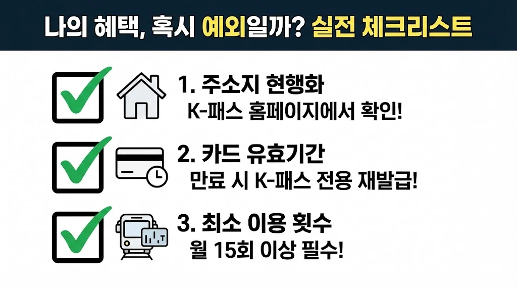 1. 주소지 현행화: 최근에 이사하셨나요? K-패스 홈페이지 내 ‘내 정보’에서 주소지가 현재 거주지와 일치하는지 반드시 확인하세요. 주소지가 예전 지역으로 되어 있다면 확장된 혜택을 못 받을 수 있습니다.