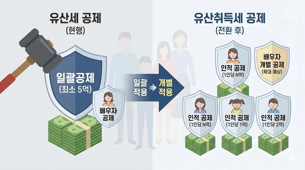 유산취득세 전환에서 가장 논란이 되는 지점은 바로 ‘상속공제’입니다. 현재는 자녀 수에 관계없이 최소 5억 원을 빼주는 ‘일괄공제’ 제도가 강력한 힘을 발휘하고 있습니다.