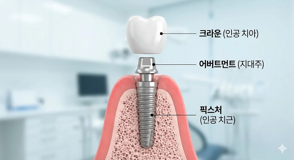 - 크라운(Crown – 인공 치아): 우리가 겉으로 보게 되는 진짜 치아 모양의 ‘머리’ 부분입니다. 음식을 씹는 핵심적인 역할을 수행합니다.
