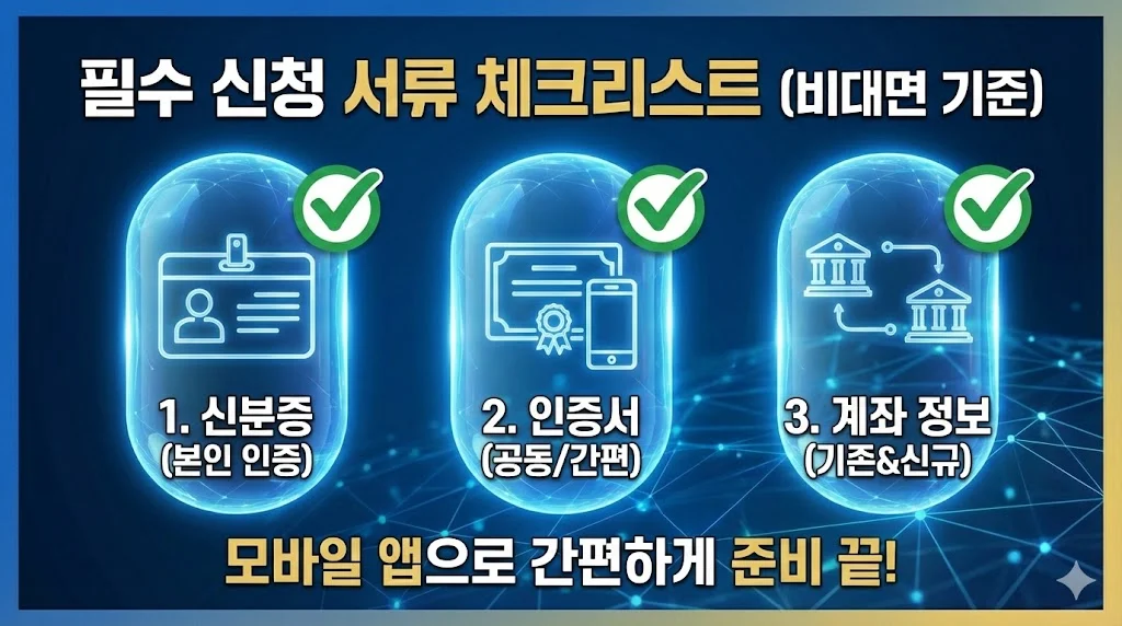 2026년 현재, 대부분의 금융기관은 모바일 앱을 통한 비대면 신청을 지원합니다. 하지만 법인 신청이나 특정 케이스의 경우 아래 서류가 필수적입니다.