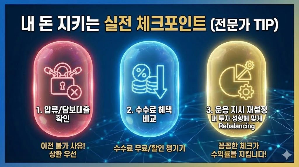 - 운용 지시 재설정: 자산이 옮겨온 후에는 새로운 환경에 맞춰 운용 지시(Rebalancing)를 다시 확인해야 합니다. 옮겨온 자산이 내 투자 성향에 맞게 잘 배치되었는지 반드시 점검하세요.