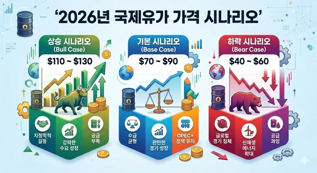 | 강세장 (Bull) | 배럴당 90달러 ~ 100달러 이상 | 중동 전쟁 확전, 호르무즈 해협 봉쇄, 중국의 대규모 경기 부양책 성공 |