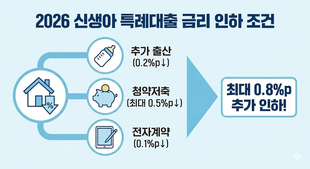 • 기존 자녀 및 신규 분양: 미성년 자녀 1명당 0.1%p, 신규 분양 주택 0.1%p 추가 혜택