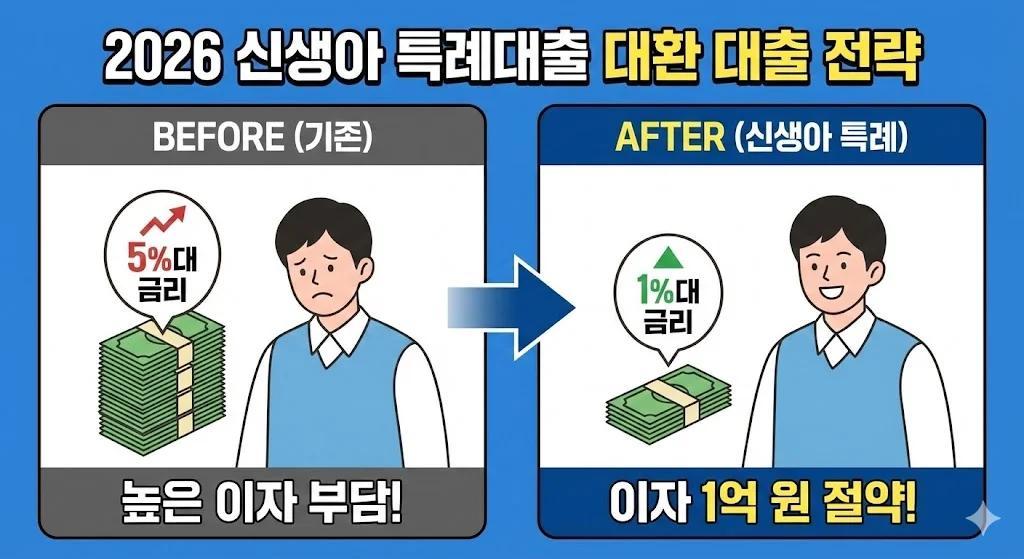 이미 집을 샀거나 높은 금리의 대출을 이용 중인 부모님들께 신생아 특례대출은 ‘가계 경제의 인공호흡기’와 같습니다. 2026년에는 기존 대출 갈아타기 절차가 더욱 간소화되었습니다.