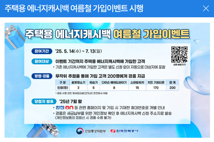 지금 바로 '한전 에너지캐시백'을 검색하고 신청하세요. 올여름, 시원한 여름과 두둑한 캐시백이라는 두 마리 토끼를 모두 잡는 현명한 주인공이 되시길 바랍니다.