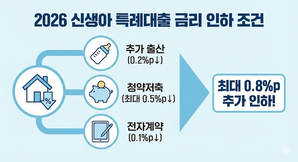 - 추가 출산 (가장 강력함): 아이를 1명 더 낳을 때마다 연 0.2%p 인하 (특례 기간 5년 연장, 최대 15년)