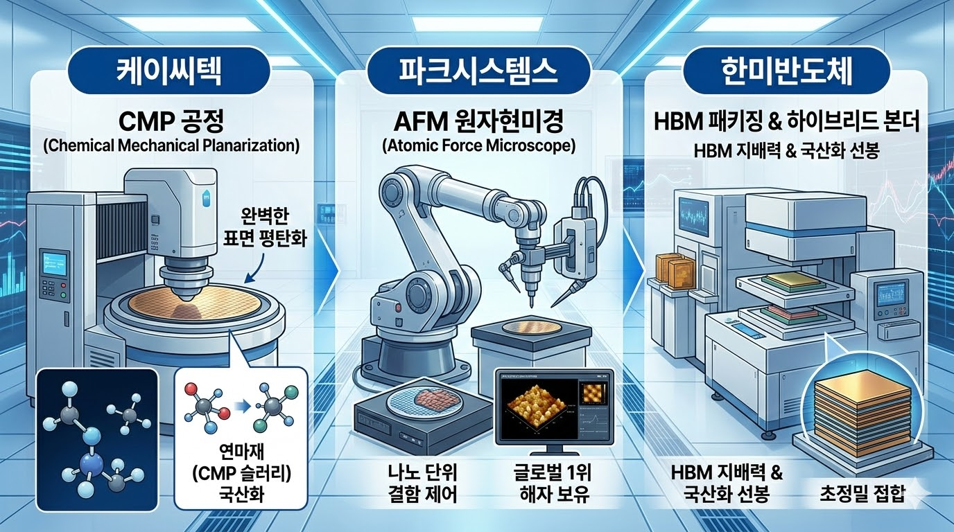 하이브리드 본딩 공정의 핵심은 '완벽하게 평탄한 표면'과 '나노 단위의 이물질 제어', 그리고 '정밀한 접합'입니다. 이 세 가지 공정을 지배하는 국내 유일무이한 대장주 TOP 3를 공개합니다.